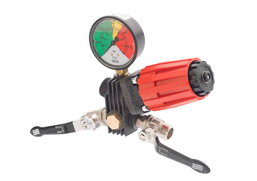 Vezérlőegység munkanyomás-szabályozó szeleppel, bypass vezérlőkarral és színes skálájú glicerinfürdős nyomásmérővel. Alkalmas AR 503, AR 30 és AR 50 szivattyúkhoz. 50 l/perc; max 40 bar
